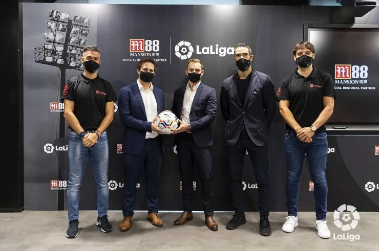 ShareLaLiga Ambassadors Luis Garcia & Fernando Morientes with M88 Creative Director celebrating the new partnership between LaLiga and M88.